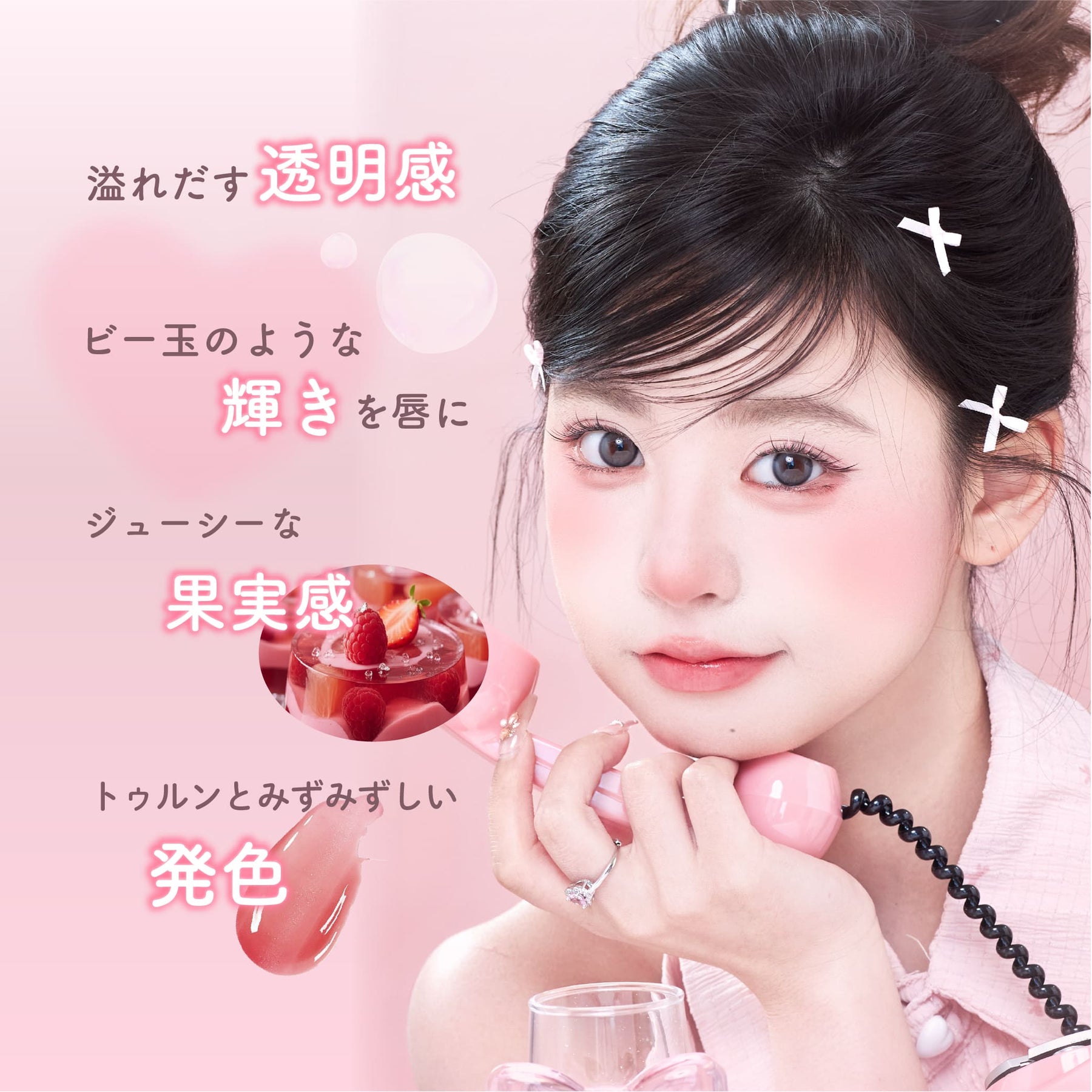 とろけるように唇になじむジューシーグロス。光を集めたようなぷるんとした唇に仕上げます。